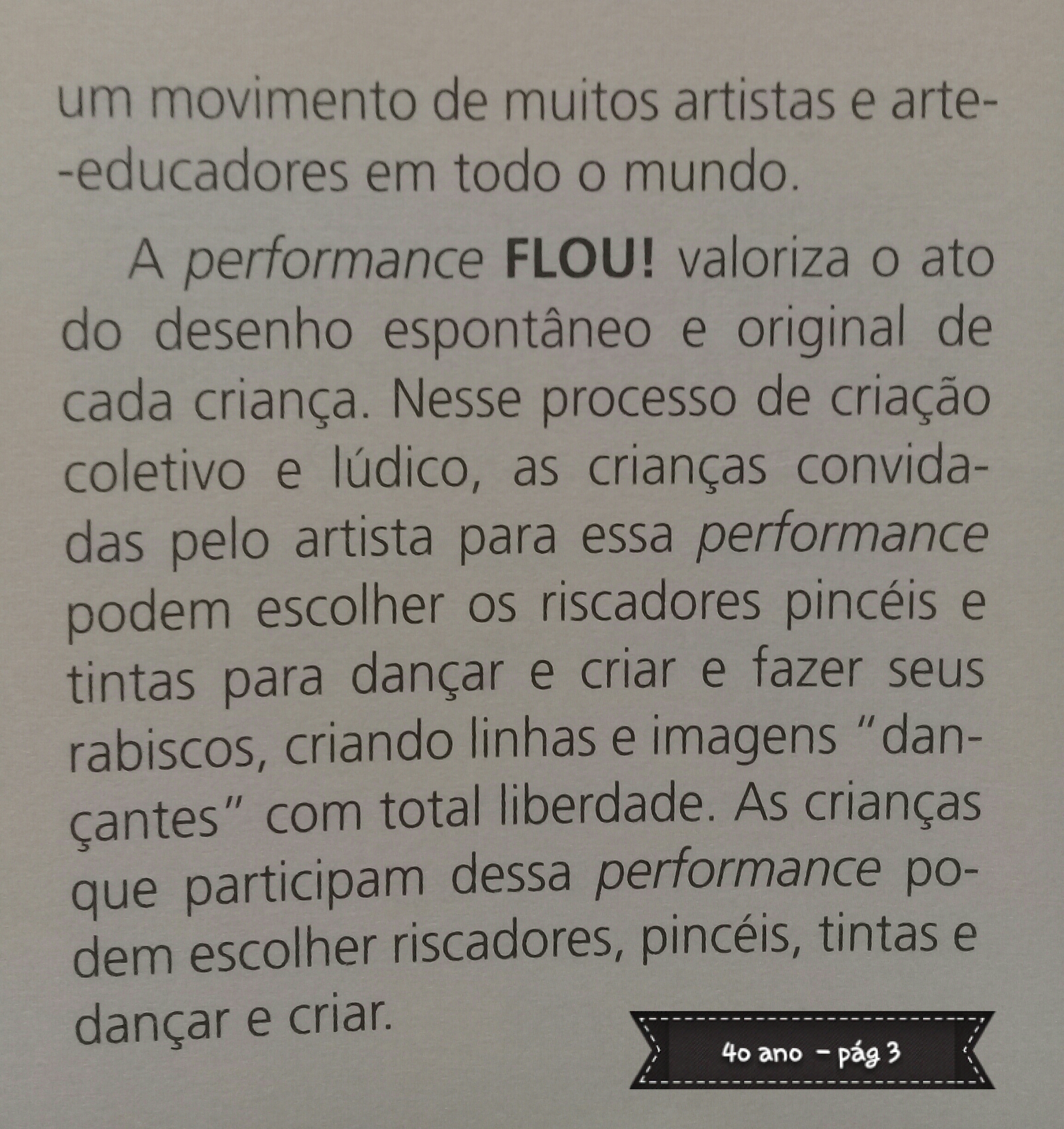 FLOU! é uma performance interativa para crianças de 4 a 10 anos que sentados ao redor de uma grande folha branca assistem e participam da criação ao vivo de um grande desenho. Os rabiscos dançantes e as tintas vão tomando vida e dialogam com o performer para que “alguns desenhos depois” surjam outros desenhos recortados feitos em experiências anteriores. Essas formas [peças] tomam conta do espaço e são as crianças que brincam compondo novos desenhos e formas e resignificando o acontecimento. Paralelamente, o desenho criado também é recortado pelo performer, gerando mais peças que alimentam o jogo e que serão utilizadas pelas crianças participantes das próximas experiências. Uma experiência coletiva, interativa e aberta que não fecha significados e que se propõe a brincar “seriamente”como toda criança faz.